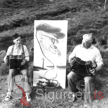 Tekin úti í Álsey. Árni Árnason, símritari frá Ásgarði og Jónas Sigurðsson í Skuld, á milli þeirra er mynd eftir Guðna Hermansen af Hjálmari Jónasyni í Dölum.