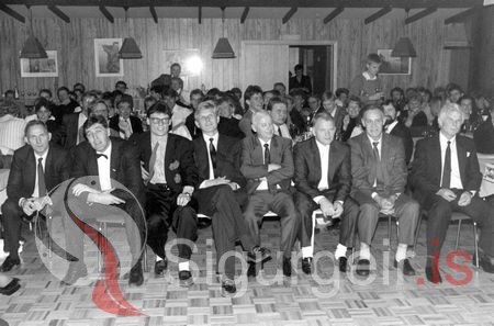 Spurningakeppni á lundaballi. Sveinn Halldórsson, Haraldur Geir Hlöðversson, Bjarnarey, Guðlaugur Sigurgeirsson, Álsey, Jóhannes Long, Ystakletti, Hávarður Sigurðsson, Elliðaey, Bryngeir Sigufússon, Brandi, Gísli Steingrímsson, Hellisey, Sigurður Elíasson, Suðurey. Myndin er tekin í Alþýðuhúsinu, 5. nóvember 1988.