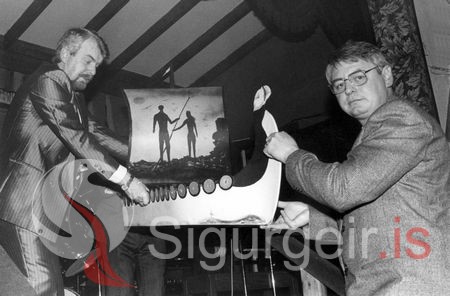 Hermann Einarsson og Valur Oddsson í Dal. Myndin er tekin á lundaballi í Alþýðuhúsinu 5. nóvember 1988.