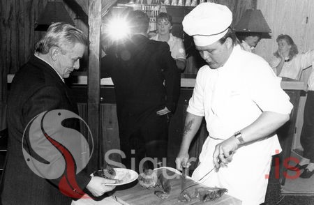 Kiddi í Brekkuhúsi lætur sig hafa það að smakka sauðarketið úr Suðurey. Kristinn Kristinsson og Tómas Sveinsson, kokkur. Myndin er tekin á lundaballi í Alþýðuhúsinu, 5. nóvember 1988.