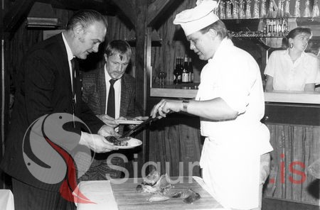Já þeir láta sig hafa það að smakka á suðaketinu úr Suðurey. Ágúst Bergsson, Sævar Ísfeld, Tómas Sveinsson kokkur, og Margrét Sveinsdóttir við barinn. Myndin er tekin á Lundaballi í Alþýðuhúsinu 5. nóvember 1988