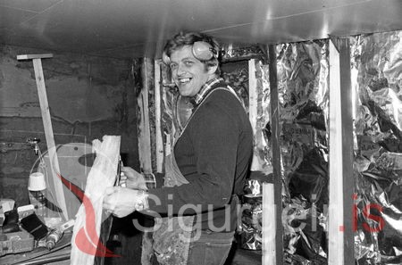 Bjarni Samúelsson við smíði á nýju eldhúsi í m/b. Valdimari Sveinssyni VE. Myndin er tekin 25. ágúst 1981.