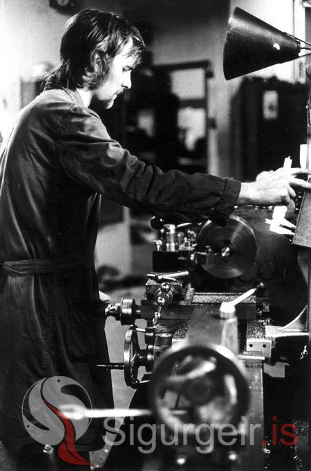 Friðrik Gíslason við rennibekkinn í Vélsmiðjunni Magna.