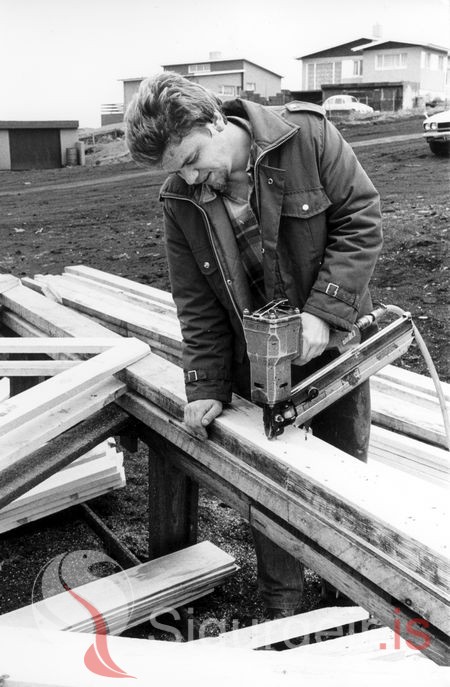 Gunnar Helgason, smiður við vinnu sína. Myndin er tekin í júlí 1980.