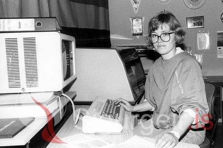 Iðunn Jóhannesdóttir. Myndin er tekin á skrifstofu Ísfélags Vestmannaeyja 21. nóvember 1986.
