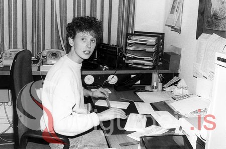 Erna Andreasen. Myndin er tekin á skrifstofu Bæjarsjóðs Vestmannaeyja 31. október 1986.