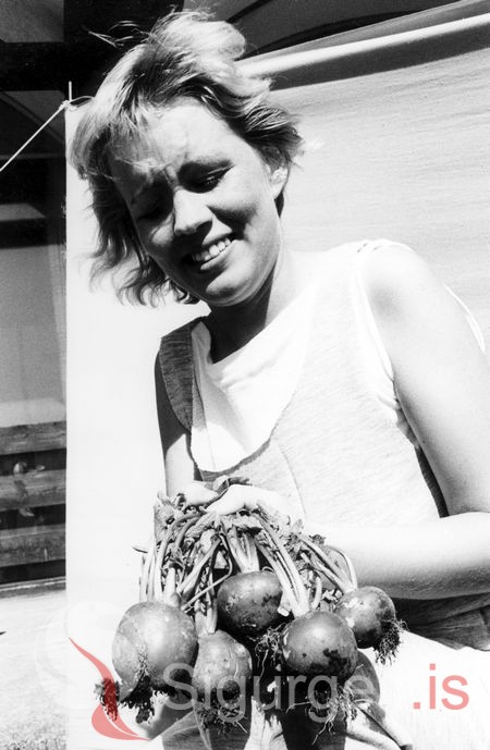 Þetta eru ekki rófur sem Guðbjörg Sveinbjörnsdóttir heldur á, heldur radísur. Myndin er tekin 1. ágúst 1984.