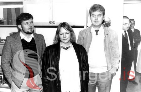 Frá vinstri: Ragnar Óskarsson frá Lambhaga, kennari, Guðmunda Steingrímsdóttir, Arnaldur Bjarnason, bæjarstjóri og bakatil sjást Björn Úlfljótsson og Þór Í. Vilhjálmsson. Myndin er tekin 30. október 1987.