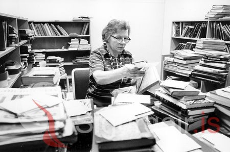 Tekin á Bókasafni Vestmannaeyja 2. desember 1977. Ilse Guðnason, bókavörður.