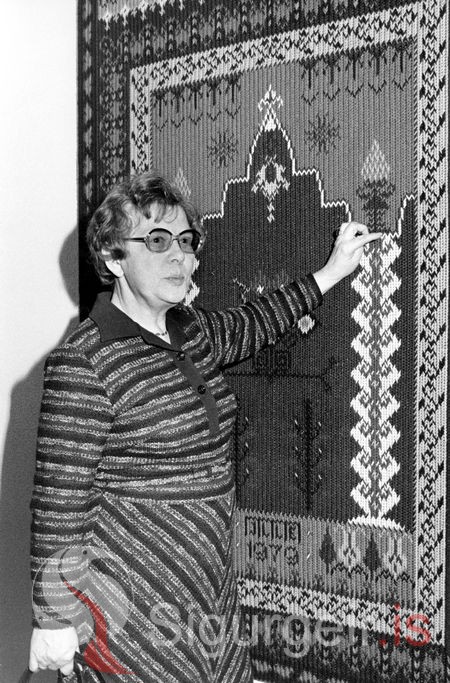 Ilse Guðnason gerði þetta mikla teppi sem gefið hefur verið Sjúkrahúsi Vestmannaeyja af Kvenfélaginu Líkn. Hún er hér að útskýra uppbyggingu og tákn hvers bekkjar og munsturs í teppinu. Myndin er tekin 14. febrúar 1979.