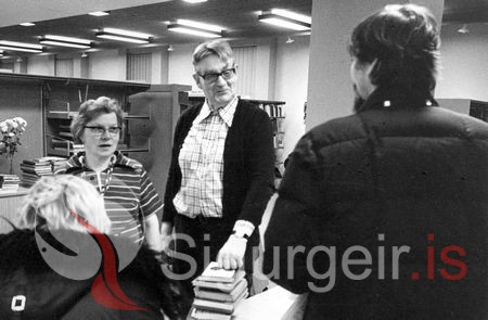 Tekin 2. desember 1977. Hjónin Haraldur og Ilse Guðnason bókaverðir á Bókasafni Vestmannaeyja ásamt Páli Zópóníassyni, bæjarstjóra.