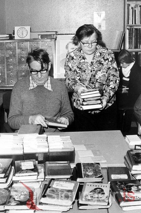 Hjónin Haraldur og Ilse Guðnason við vinnu sína á Bókasafni Vestmannaeyja. Myndin er tekin 18. janúar 1977.