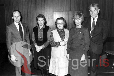 Frá vinstri: Helgi Bernódusson frá Borgarhól, Ágústa Ágústsdóttir frá Aðalbóli, Ilse Guðnason, Hrafnhildur Sigurðardóttir og Haraldur Guðnason. Myndin er tekin 4. desember 1982.