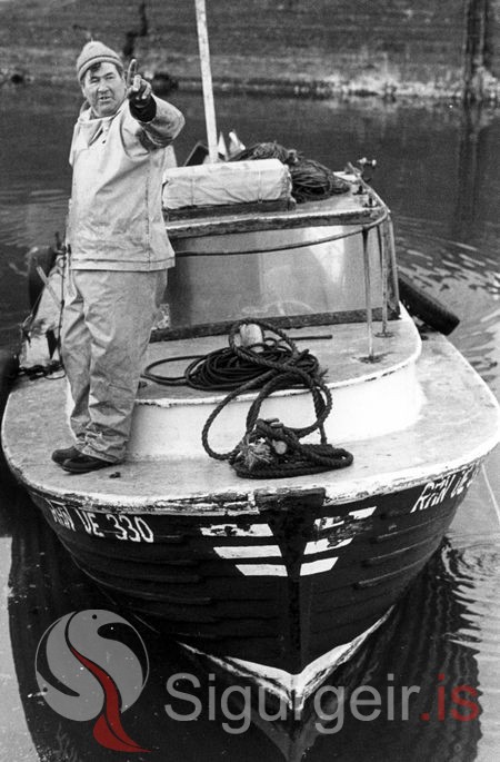 Ágúst Ólafsson frá Gíslholti á trillunni sinni Rán Ve. Myndin er tekin 26. apríl 1980.
