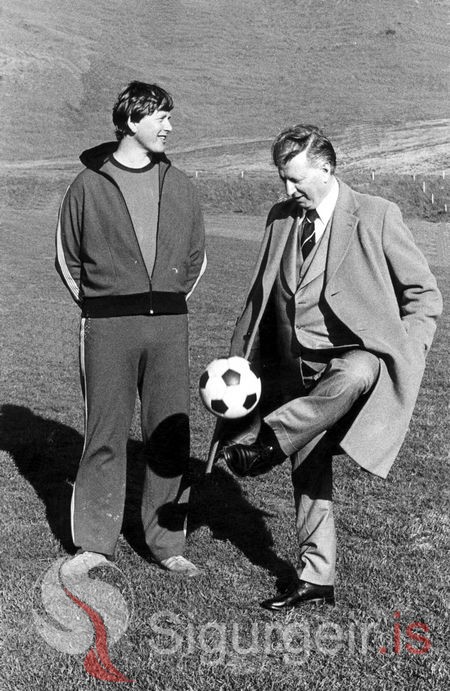 Viktor Helgason hjá ÍBV og Albert Guðmundsson. Það sést að Albert hefur engu gleymt. Myndin er tekin í Vestmannaeyjum 10. júní 1980.
