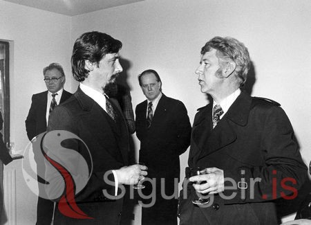 Tekin 15. apríl 1978, þegar eigendur byggingarfélagsins Áshamars hf. héldu uppá lok byggingar fyrstu Áshamarsblokkarinnar. Á myndinni eru: Páll Zóphóníasson, bæjarstjóri og Jóhann Friðfinnsson, bakatil sjást þeir Sigurgeir Kristjánsson og Grétar Þórarinsson, pípulagningameistari og einn eigenda Áshamars hf.