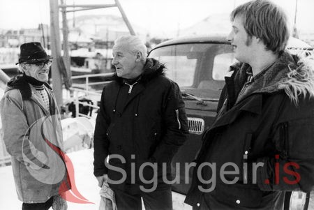Málin rædd á bryggjunni, aflahorfur, veðrið, fiskverðið og mannlífið. Sveinbjörn Snæbjörnsson, Ingvald Andersen og Leó Óskarsson. Myndin er tekin 18. janúar 1979.