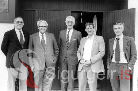 Guðjón Magnússon, aðstoðarlandlæknir, Matthías Bjarnason, heilbrigðisráðherra, Jóhann Friðfinnsson, stjórnarformaður, Björn Ívar Karlsson, skurðlæknir, Eyjólfur Pálsson, framkvæmdastjóri.