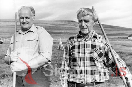 Frístundabændur í heyskap á Breiðabakka. Jón Gunnlaugsson frá Gjábakka og Birgir Sigurjónsson frá Sólheimum. Myndin er tekin 13. ágúst 1985.