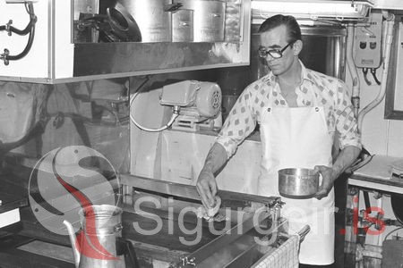 Tekin árið 1979. Hér er Sigurvin, afleysingakokkur á Vestmannaey VE-54 að elda ofan í mannskapinn.