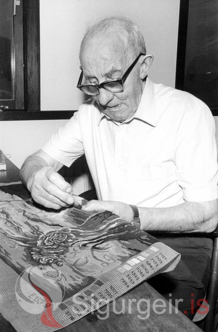 Hermann Jónsson, 85 ára og vinnur hér við sitt verk. Myndin er tekin 14. febrúar 1984 á Hraunbúðum, dvalarheimili aldraðra í Vestmannaeyjum.
