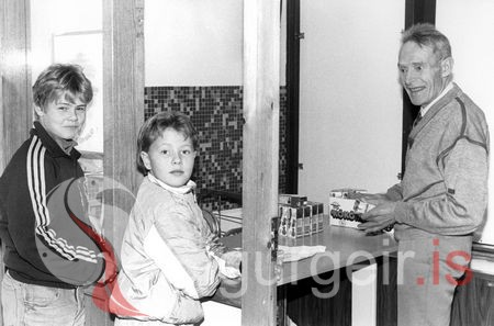 Tekin í október 1990. Hlöðver Johnsen (1919-1997) á Saltabergi, húsvörður í Barnaskóla Vestmannaeyja ásamt nemendum.