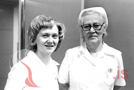 Tekin á Sjúkrahúsi Vestmannaeyja í desember 1977. Selma Guðjónsdóttir frá Gvendarhúsi og Helga Jóhannesdóttir.