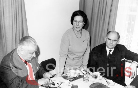 Tekin á 35 ára afmæli Sjúkrasamlags Vestmannaeyja 1. apríl 1971. Páll Þorbjörnsson, Guðmunda Gunnarsdóttir og Magnús H. Magnússon.