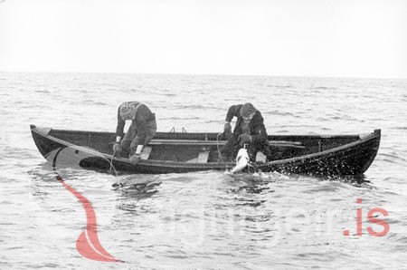 Myndin er tekin í maí 1979 við gerð kvikmyndar Páls Steingrímssonar og Ernst Kettlers "Vestmannaeyjar 1873" í bátnum eru Sveinn Tómasson og Guðmundur Tegeder.