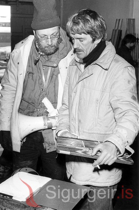 Myndin er tekin í mars 1983 við tökur á kvikmynd Þráins Bertelssonar Nýtt líf. Þráinn Bertelsson og Sigurgeir Scheving á tökustað.