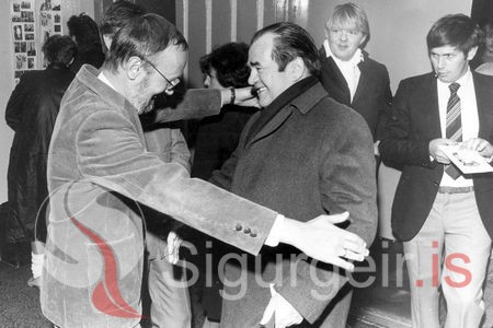 Þráinn Bertelsson tekur á móti Runólfi Dagbjartssyni, einum af aðalleikurum myndarinnar. Til hliðar eru Jóhannes Ágúst Stefánsson og Gísli Valur Einarsson frá Brekku.