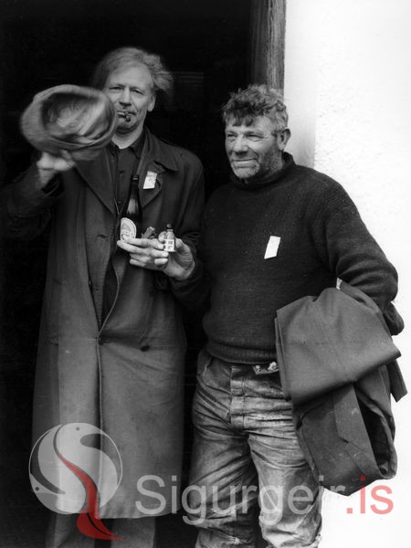 Tekin á 1. maí fyrir utan efnalaugina Straum, Skólavegi 4. Ameríkugeiri (Sigurgeir Gunnarsson) og Gölli Valda (Árni Valdason), þekktir borgarar í Eyjum um miðja síðustu öld.
