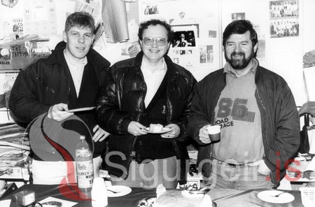 Tekin í febrúar 1990. Ómar Garðarsson, Sigurður Einarsson og Georg Þór Kristjánsson frá Klöpp, mættir í morgunkaffi á Reynistað.