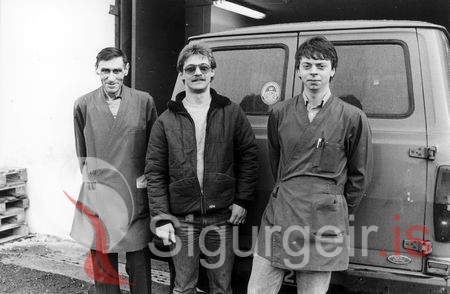 Tekin á Tanganum 29. apríl 1986. Þessir sjá um að afgreiða bátana með kost. Tómas Geirsson í Framtíð, Halldór B. Halldórsson og Tómas Guðjónsson.