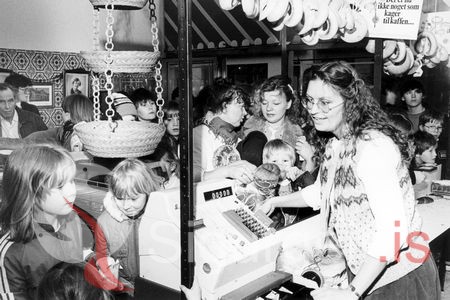 Tekin í Magnúsarbakaríi 23. janúar 1983. Hrafnhildur Ástþórsdóttir er við afgreiðslu og fyrir framan borðið standa Dóra Svavarsdóttir og Aðalheiður Halldórsdóttir.