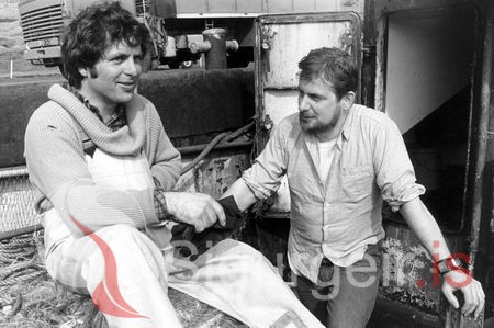 Tekin 9. maí 1981. Skipverjarnir á Bylgju Ve. á spjalli við vertíðarlok. Gísli Ingólfsson, vélstjóri og Jóhann Hjartarsson, matsveinn.