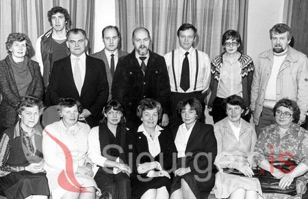 Aftari röð: Sigurbjörg Óskarsdóttir, Haraldur Geir Höðversson, Kristinn Sigurðsson á Skjaldbreið, Gunnar Jónsson, Sveinn Tómasson, Eiríkur Guðnason frá Vegamótum, Hjálmfríður Sveinsdóttir, kennari, Hermann Einarsson, kennari.