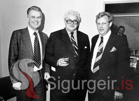 Hörður Felixson, Gísli Ólafsson og Haraldur Gíslason. Bakatil sést Jón Ísak Sigurðsson á Látrum, lóðs.