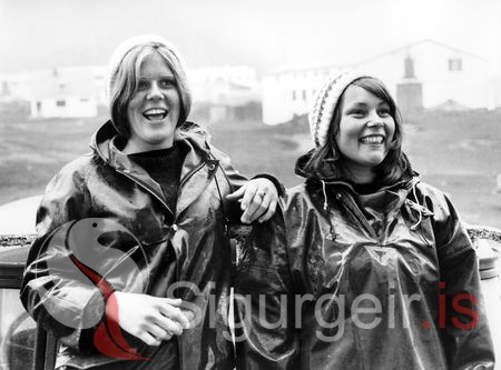 Tekin 12. ágúst 1973. Þær eru bjartsýnar og broshýrar. Bjartey Sigurðardóttir og Hrefna Guðjónsdóttir á Hvoli.