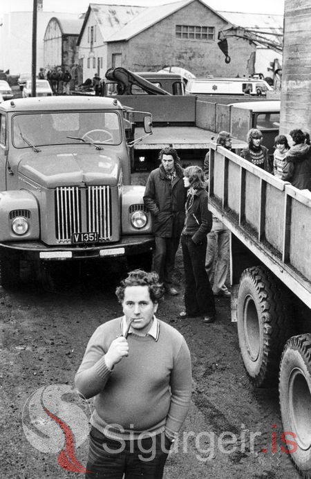 Tekin 7. febrúar 1976. Fremstur er Adolf Sigurjónsson, fyrir aftan standa Magnús Guðjónsson frá Reykjum og Helgi Leifsson.