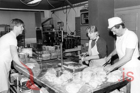 Tekin í Vilberg-kökuhúsi 9. apríl 1985. Guðbjartur Guðbjartsson bakari, Elín Leifsdóttir og Bergur Sigmundsson, bakari.