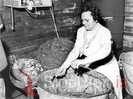 Tekin árið 1960. Margrét Sveinsdóttir á Hólmi er hér að beita loðnu.