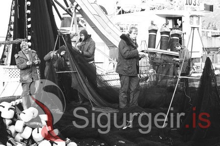 Netamenn frá Net h/f við nótabætningu á bryggjunni. Finnbogi Ólafsson, Jóhann Georgsson, Sigurbjörn Óskarsson, Haraldur Óskarsson og Haraldur Júlíusson.