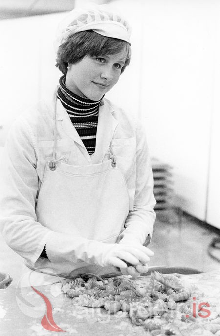 Tekin í Fiskiðju Vestmannaeyja 27. maí 1977. Ingibjörg Þórhallsdóttir í humarvinnu.