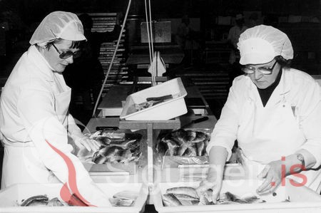 Tekin 22. október 1982 í pökkunarsal Vinnslustöðvar Vestmannaeyja. Svala Ingólfsdóttir og Sigríður Guðmundsson (Bettý).