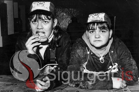Skólastelpur í Fiskiðjunni í páskafríinu. Kristný Tryggvadóttir og Áróra Karlsdóttir. Myndin er tekin 14. apríl 1981.