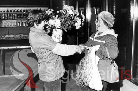 Tekin 6. Júní 1979. Helga Tómasdóttir og Helga Björgvinsdóttir, fyrsti viðskiptavinurinn á nýja Tanganum.
